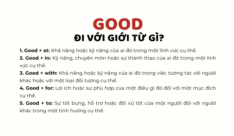 Trong tiếng Anh, các cụm từ good at, good in và good with đều mang nghĩa “giỏi / tốt”, nhưng cách sử dụng lại hoàn toàn khác nhau. Rất nhiều người học dễ nhầm lẫn khi dùng ba cấu trúc này dẫn đến việc bị mất điểm khi làm bài tập tiếng Anh.