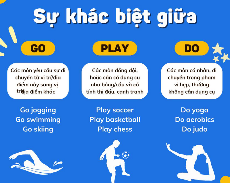 “GO” dùng với các hoạt động thường kết thúc bằng -ing, đặc biệt là hoạt động cá nhân, ngoài trời, thể thao hoặc giải trí. Không dùng “GO” cho môn thể thao có luật hoặc chơi theo đội. Thường dùng với hoạt động cá nhân hoặc giải trí, đôi khi kết hợp với địa điểm