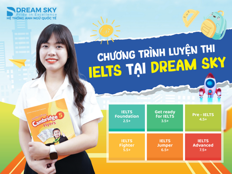 Được thành lập từ năm 2011 với sứ mệnh phát triển toàn diện tiếng Anh các kỹ năng, giúp học viên thành thạo và tự tin sử dụng tiếng Anh. Dream Sky tự hào là thương hiệu uy tín trong giảng dạy tiếng Anh, giữ vị thế tiên phong về đào tạo tiếng Anh chuẩn Quốc tế tại Hà Nội. Nếu phụ huynh và học sinh đang quan tâm đến chương trình luyện thi IELTS tại Dream Sky, hãy chủ động liên hệ để có thêm sự tư vấn nhé!
