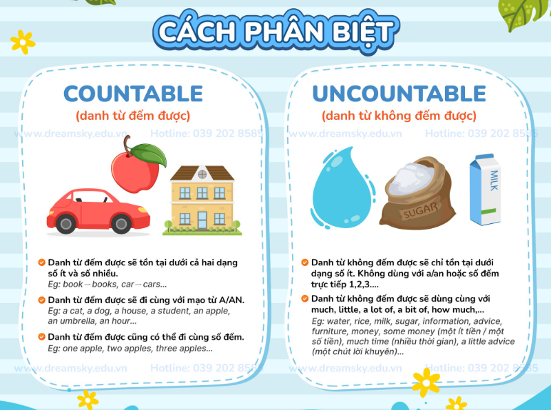 Trong tiếng Anh sẽ có hai loại danh từ mà không phải ai cũng biết hoặc hiểu rõ. Đó chính là danh từ đếm được và danh từ không đếm được. Vậy hai loại danh từ này có gì giống và khác nhau? Hãy cùng Dream Sky thì hiểu bạn nhé.