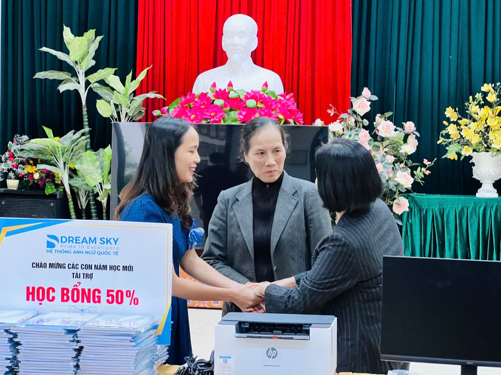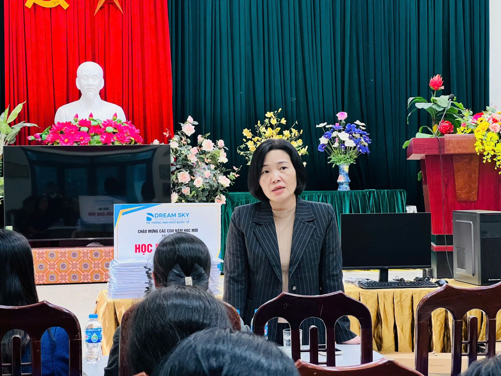 Bà Vũ Thị Tuyết (Phó giám đốc trung tâm Anh ngữ Dream Sky) đã thay mặt cho công ty trao bộ quà tặng thiết thực, phục vụ nhu cầu học tập và sinh hoạt cộng đồng của người dân, trong đó có các bạn nhỏ.
