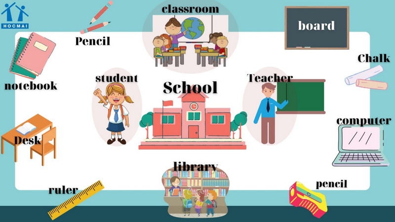 Khi bắt đầu học tiếng Anh chủ đề trường học, trẻ nên tiếp cận từng nhóm từ vựng quen thuộc gắn liền với đời sống hằng ngày. Cách học này giúp bé ghi nhớ nhanh và dễ ứng dụng trong thực tế.