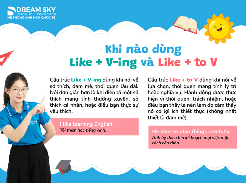 Like + V-ing và Like + to V đều được sử dụng để nói về sở thích. Tuy nhiên, tùy theo ngữ cảnh mà chúng ta sẽ lựa chọn cấu trúc Like + V-ing hoặc Like + to V cho đúng nghĩa của câu. Cùng Dream Sky phân biệt Like + V-ing và Like + to V để không bị mất điểm khi làm bài tập tiếng Anh nhé!