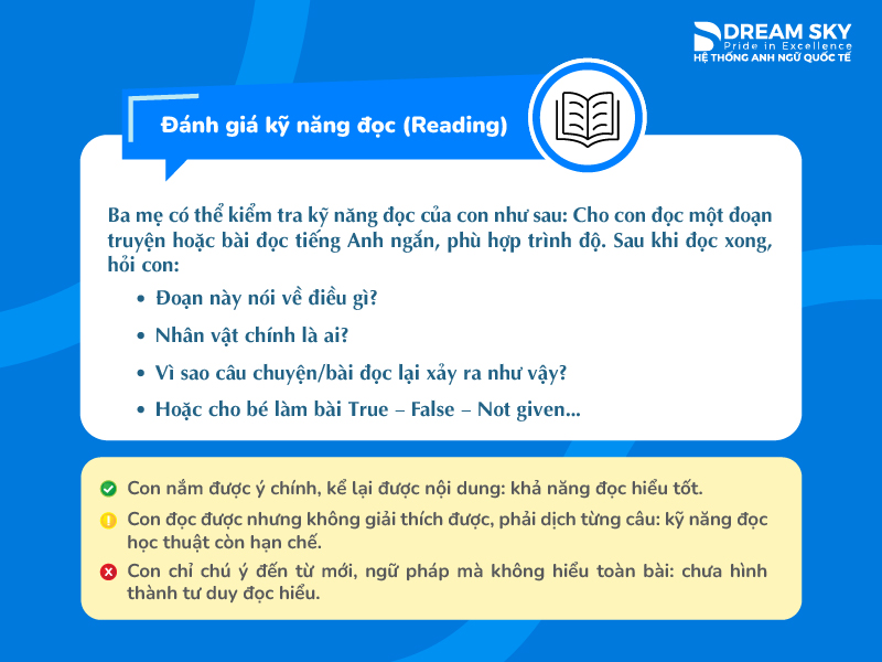 Nhấn mạnh Reading không đơn giản là đọc chữ ba mẹ nhé. Nhiều học sinh đọc tiếng Anh trôi chảy nhưng khi hỏi lại nội dung thì lại không hiểu hoặc hiểu rất mơ hồ. Điều này cho thấy trẻ mới dừng ở mức đọc mặt chữ, chưa đạt đến đọc hiểu thực sự.