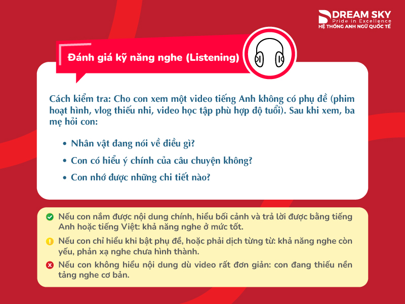 ⚠️ Nếu con chỉ hiểu khi bật phụ đề, hoặc phải dịch từng từ: khả năng nghe còn yếu, phản xạ nghe chưa hình thành.