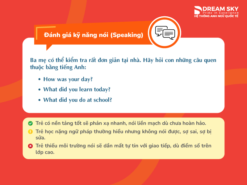 Ba mẹ có thể kiểm tra rất đơn giản tại nhà. Hãy hỏi con những câu quen thuộc bằng tiếng Anh: