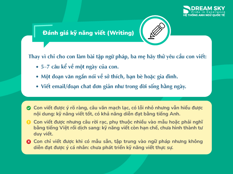 Ngoài việc đánh giá năng lực tiếng Anh qua 4 kỹ năng nghe – nói – đọc – viết, ba mẹ cũng có thể dựa vào sự thể hiện của trẻ để có đáp án cho riêng mình.