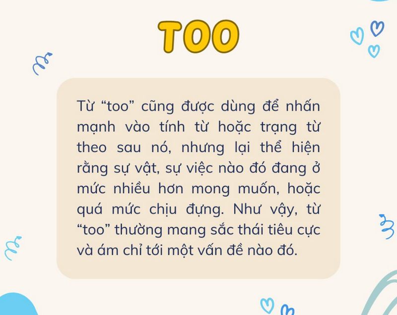 TOO = quá (mang nghĩa tiêu cực / vượt mức)
