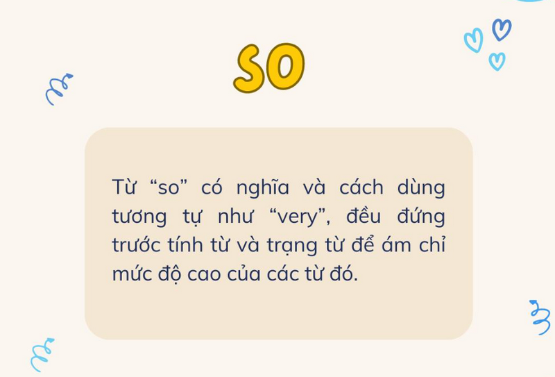 “So” là một trạng từ (adverb) dùng để làm tăng mức độ của tính từ (adj) hoặc trạng từ (adv). “So” thường mang cảm xúc mạnh hơn (ngạc nhiên, than phiền, xúc động, nhấn mạnh) và cũng không có nghĩa tiêu cực.