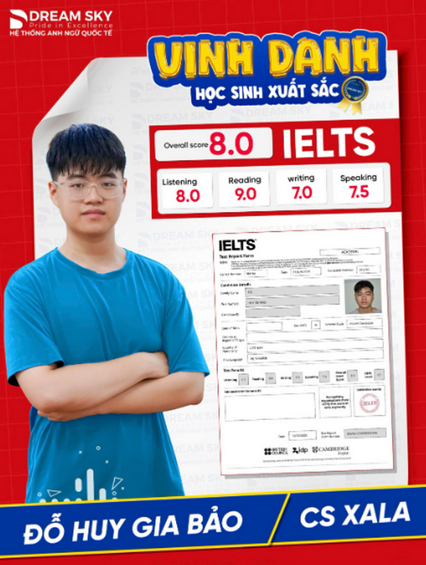 Xin chúc mừng học viên Đỗ Huy Gia Bảo (lớp 62.IELTS Advanced – CS Xa La) với kết quả IELTS 8.0 đầy xuất sắc. Đây là minh chứng cho nỗ lực và tinh thần học tập đáng ngưỡng mộ của em. Đây cũng chính là minh chứng cho chất lượng giảng dạy của Dream Sky.